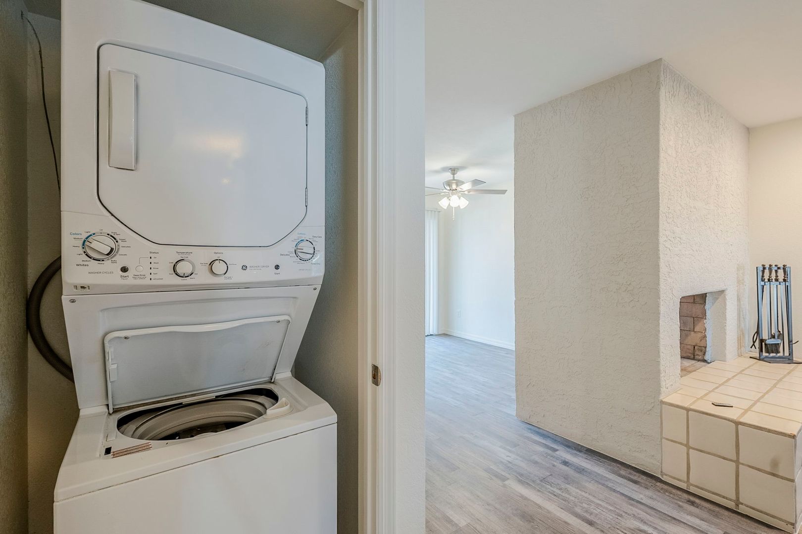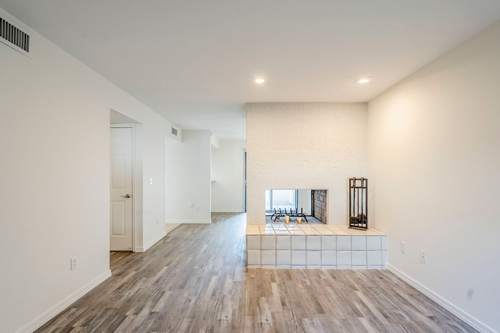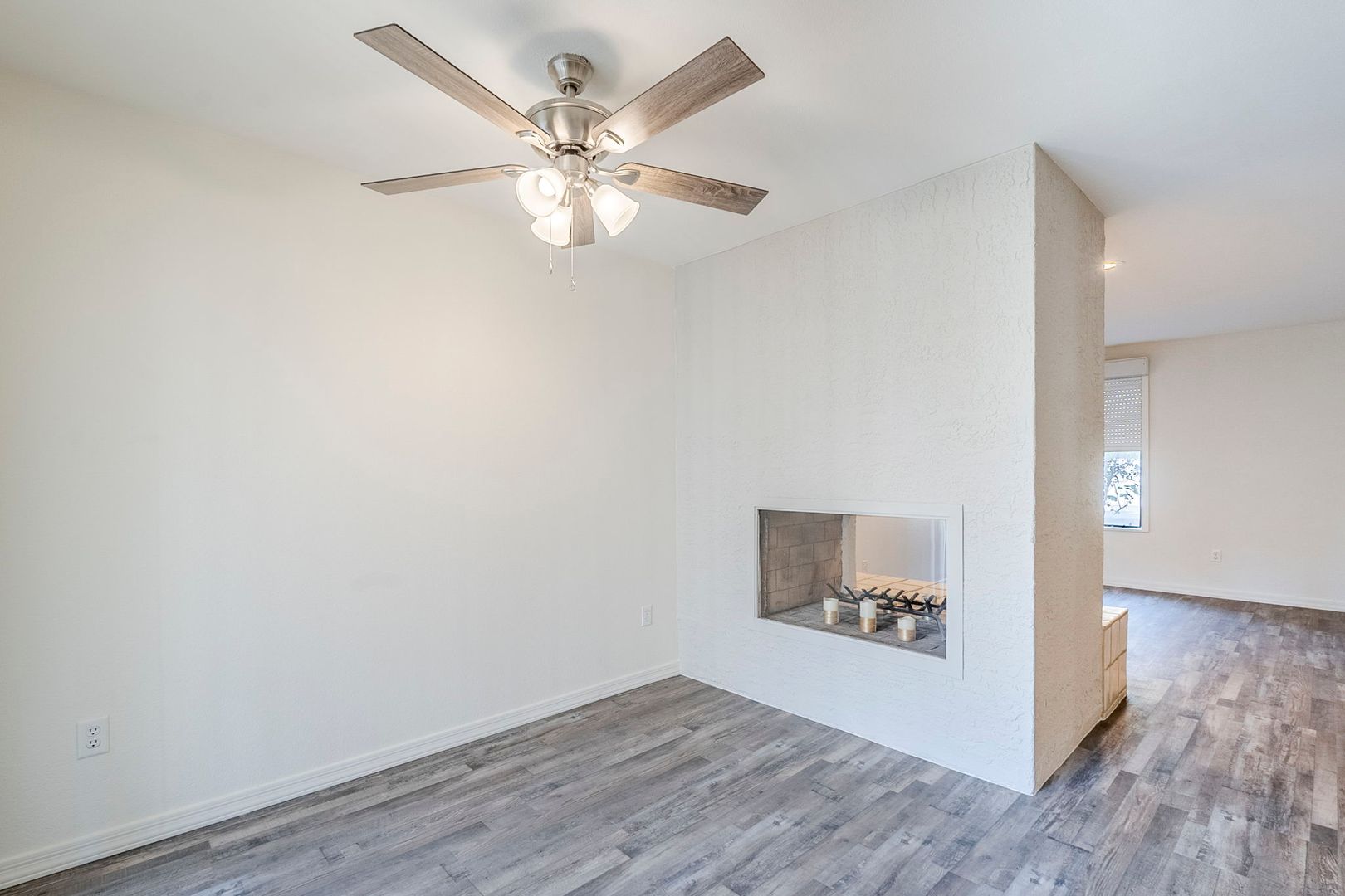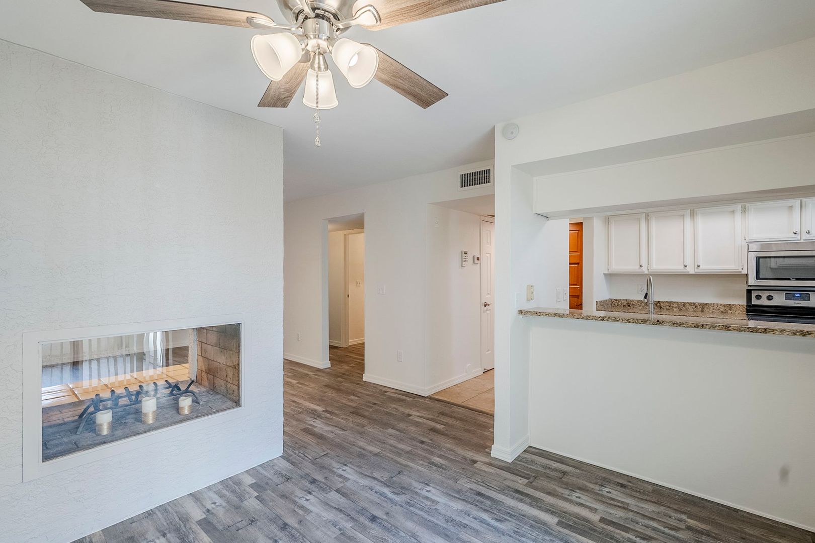Inside, you’ll find hard flooring throughout, creating a sleek and low-maintenance space. The double-sided fireplace adds a cozy touch, perfect for relaxing evenings. The kitchen comes fully equipped with all appliances included, making move-in a breeze. Plus, water, sewer, and trash are covered in your rent!